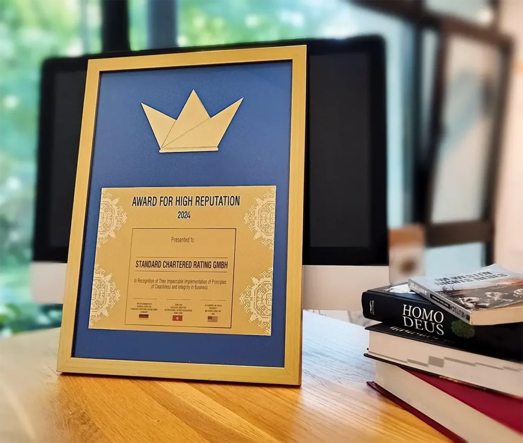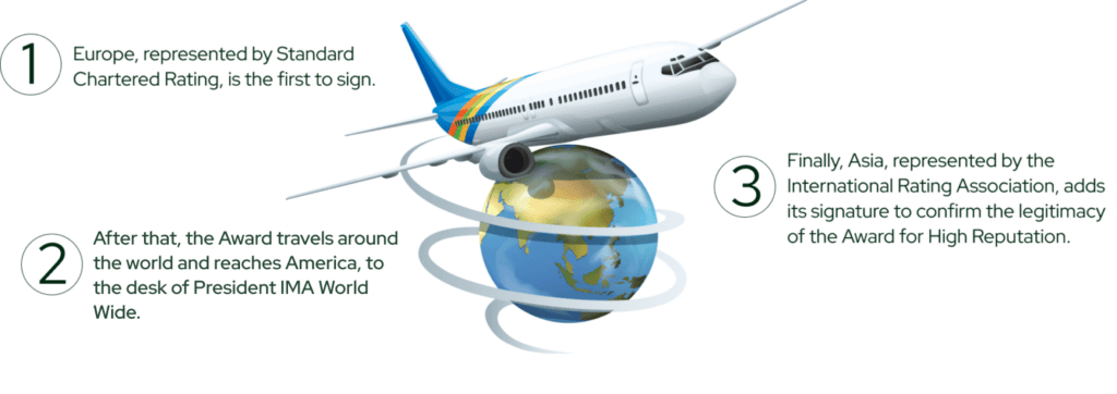 Finally, Asia, represented by the International Rating Association, adds its signature to confirm the legitimacy of the Award for High Reputation.